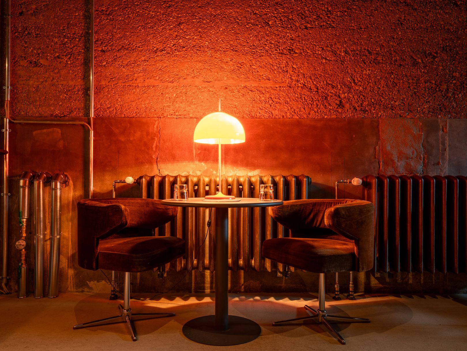 Bar Martinelli is located in the basement of the historic Betriebswerk building, one of Germany’s oldest railway depots. The raw architectural character of the building - its original sprayed concrete walls dating back to the 1920s -has been carefully preserved as part of the protected structure. This historic framework is contrasted with interior elements inspired by 1960s and 70s design, creating a space where industrial heritage meets a more refined atmosphere.