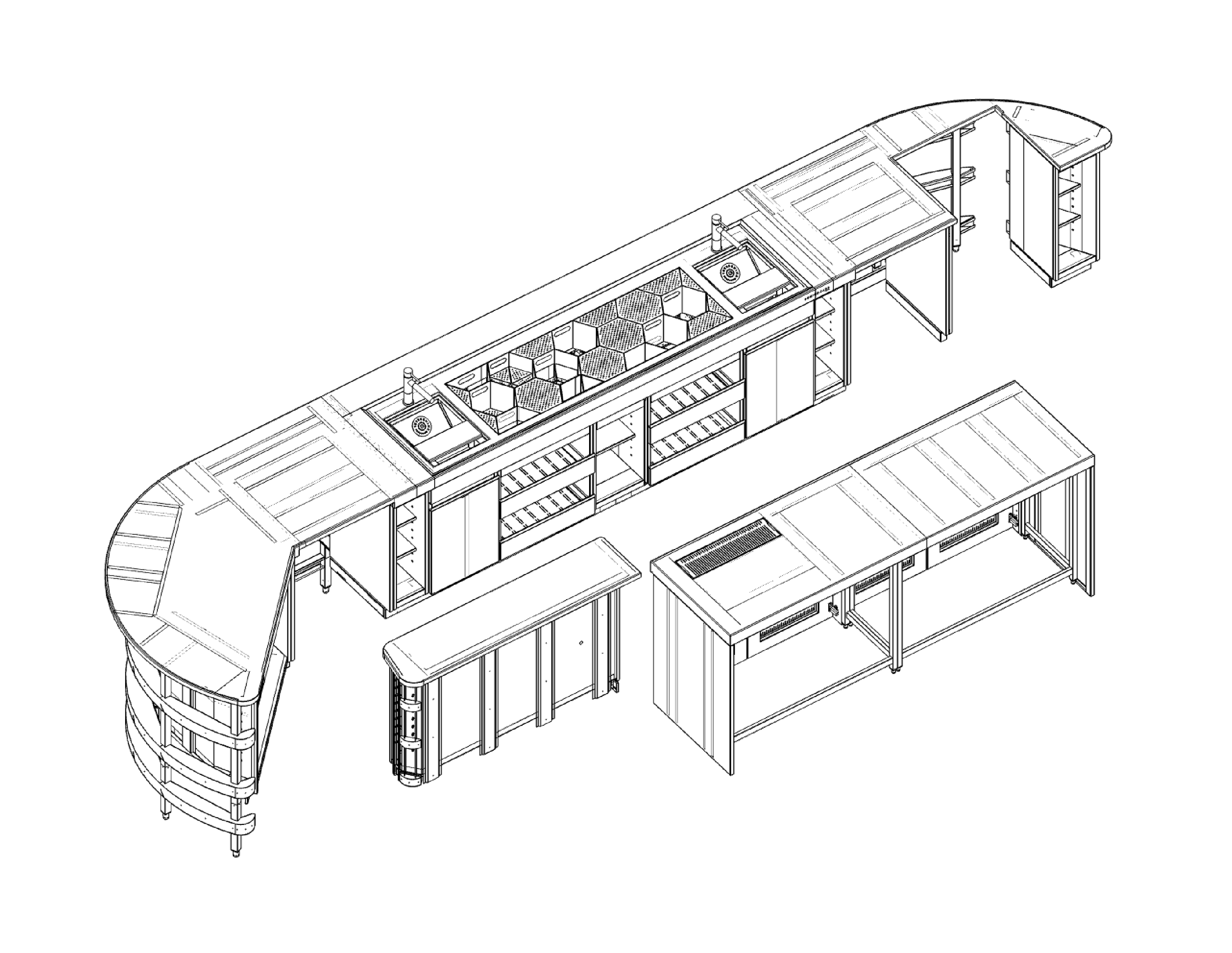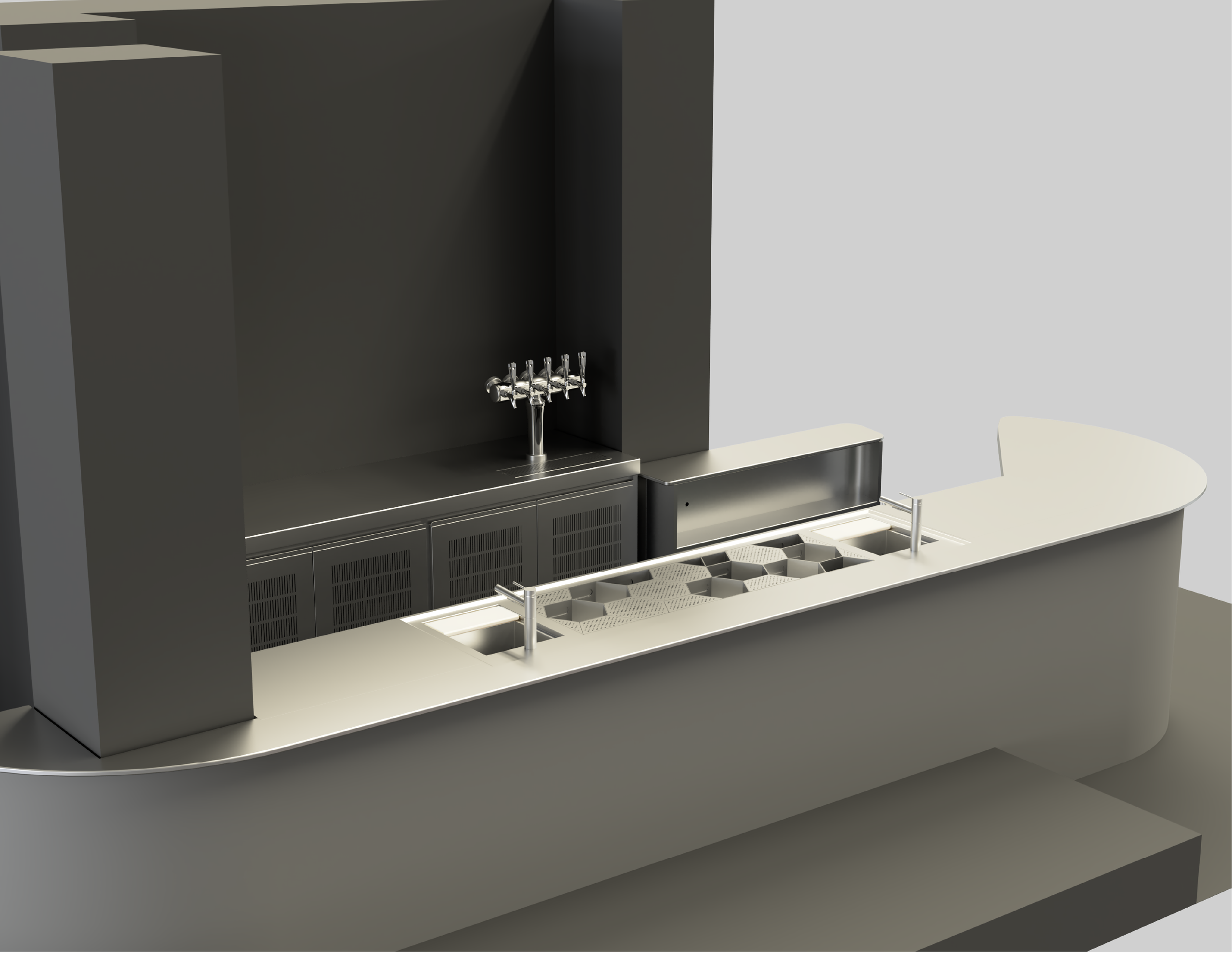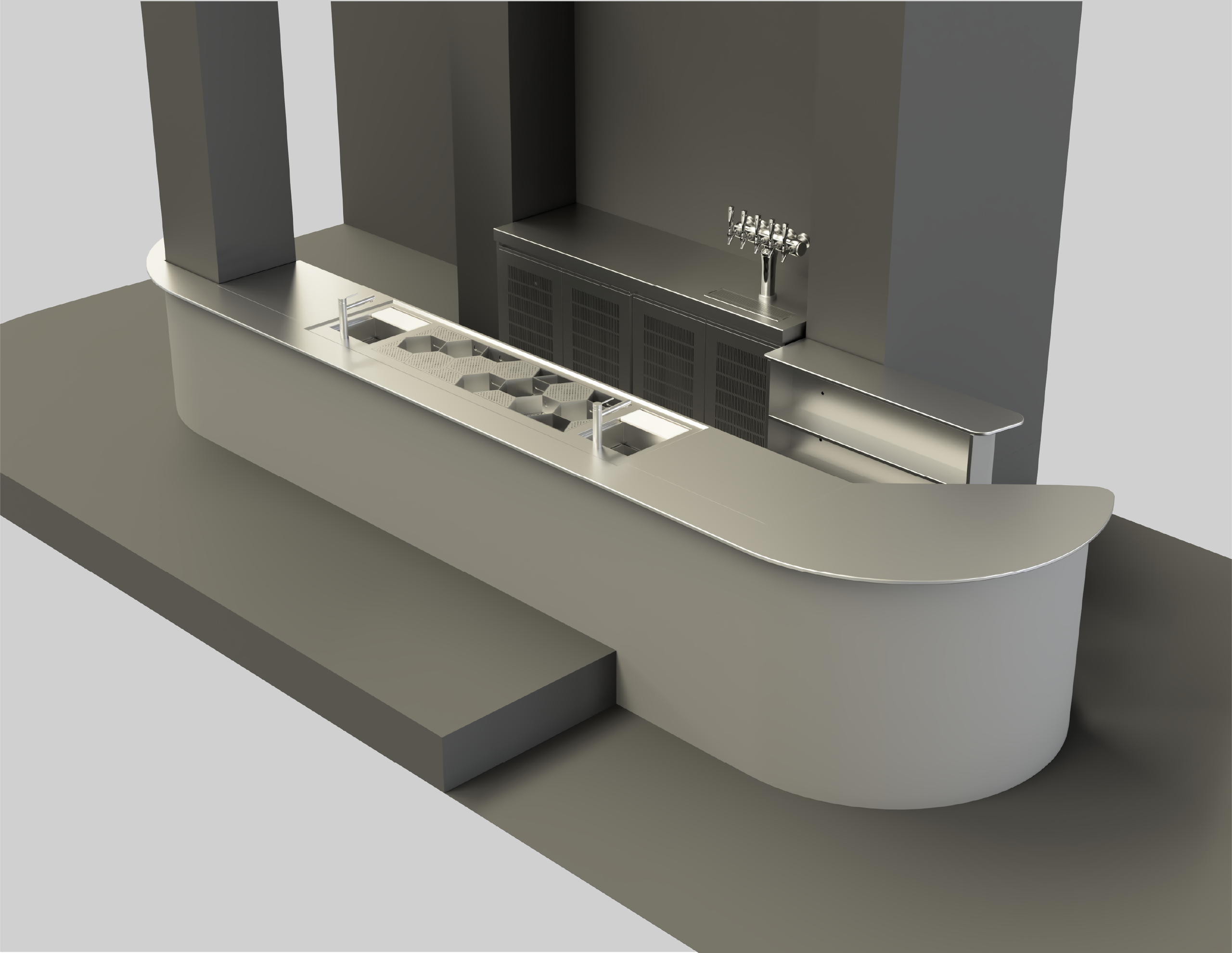 Two-bartender station with integrated polivibre guest top, split-level step, custom storage, and draft system cabinet.